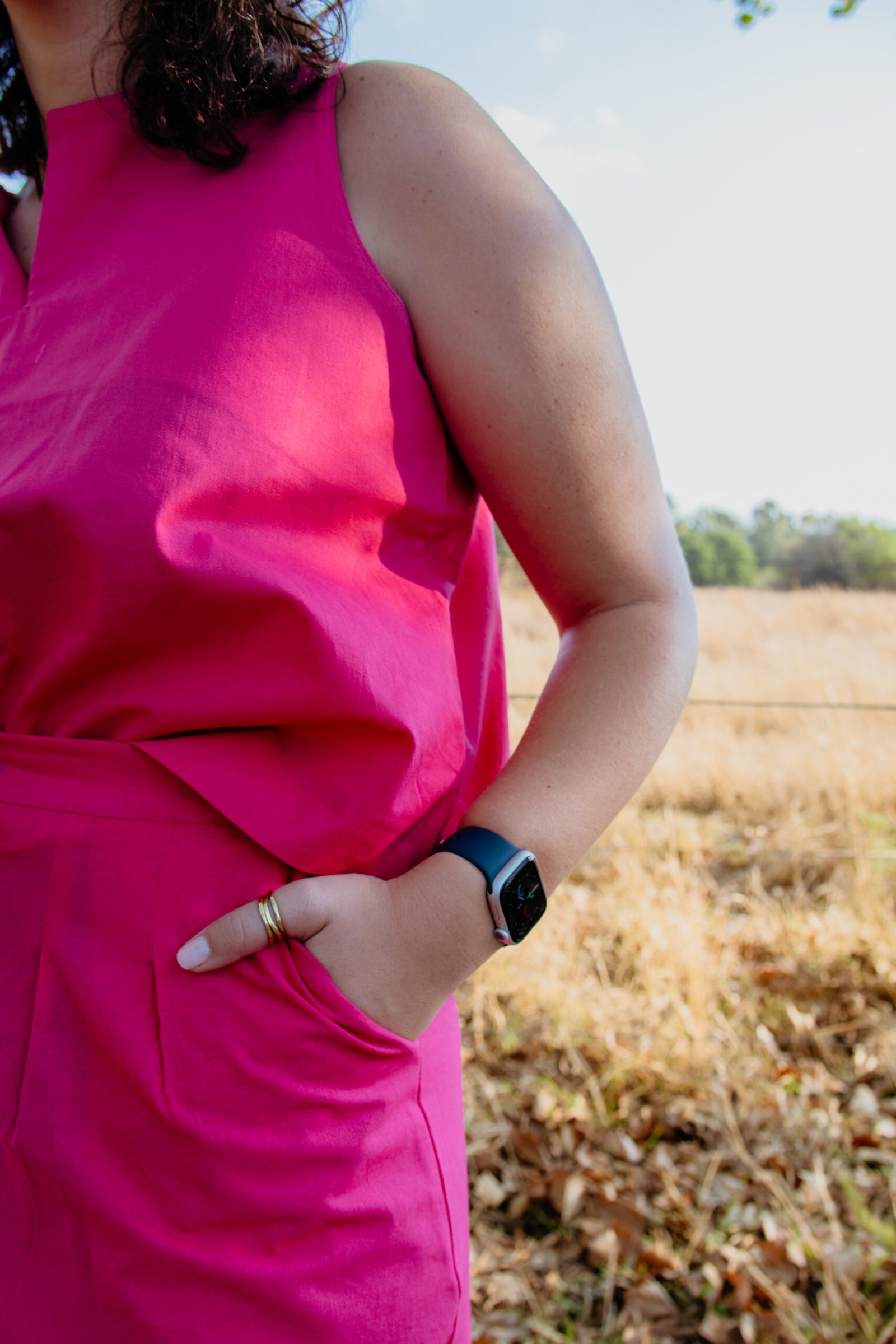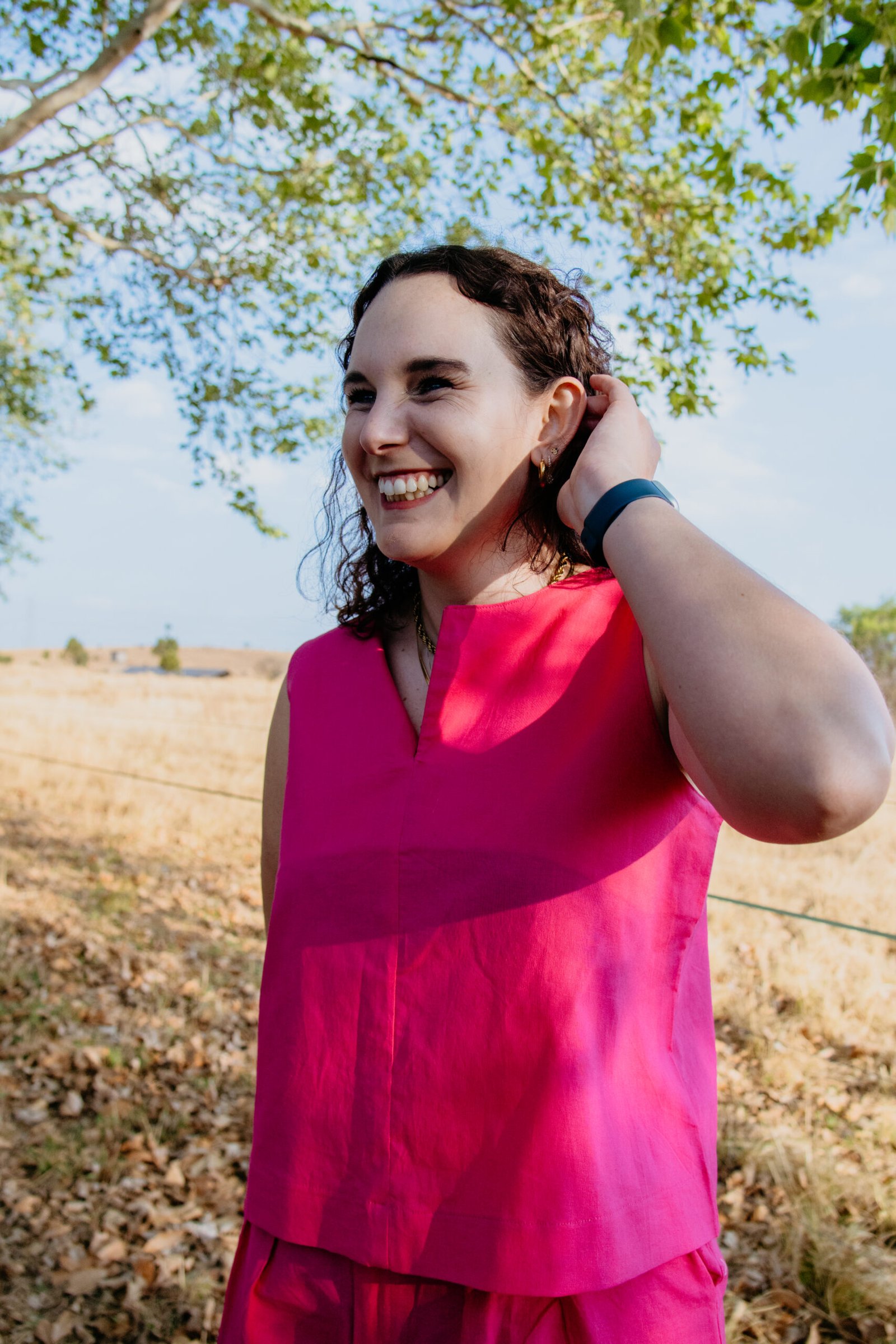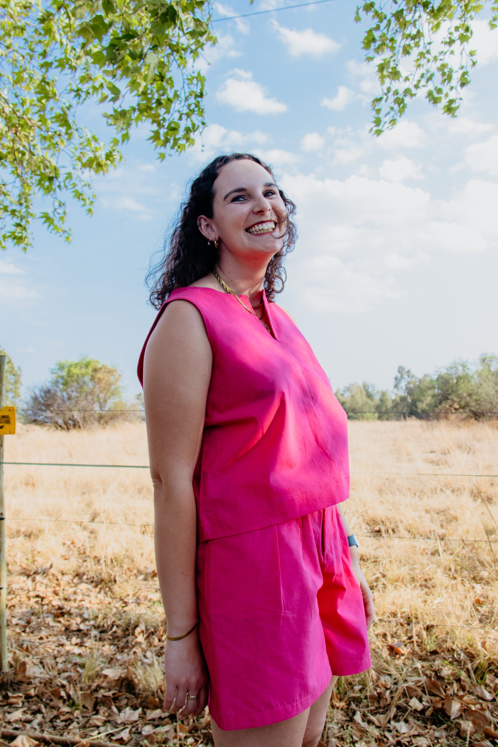 Details | Sleevless, boxy tank top with a keyhole-neckline paired with high-waisted relaxed shorts.